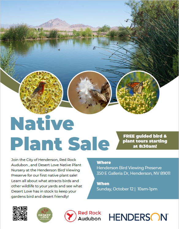 Join Red Rock Audubon, the Henderson Bird Viewing Preserve and Desert Love for a native Plant sale. Learn about what plants work best for our area, which plants attract our native birds and butterflies!